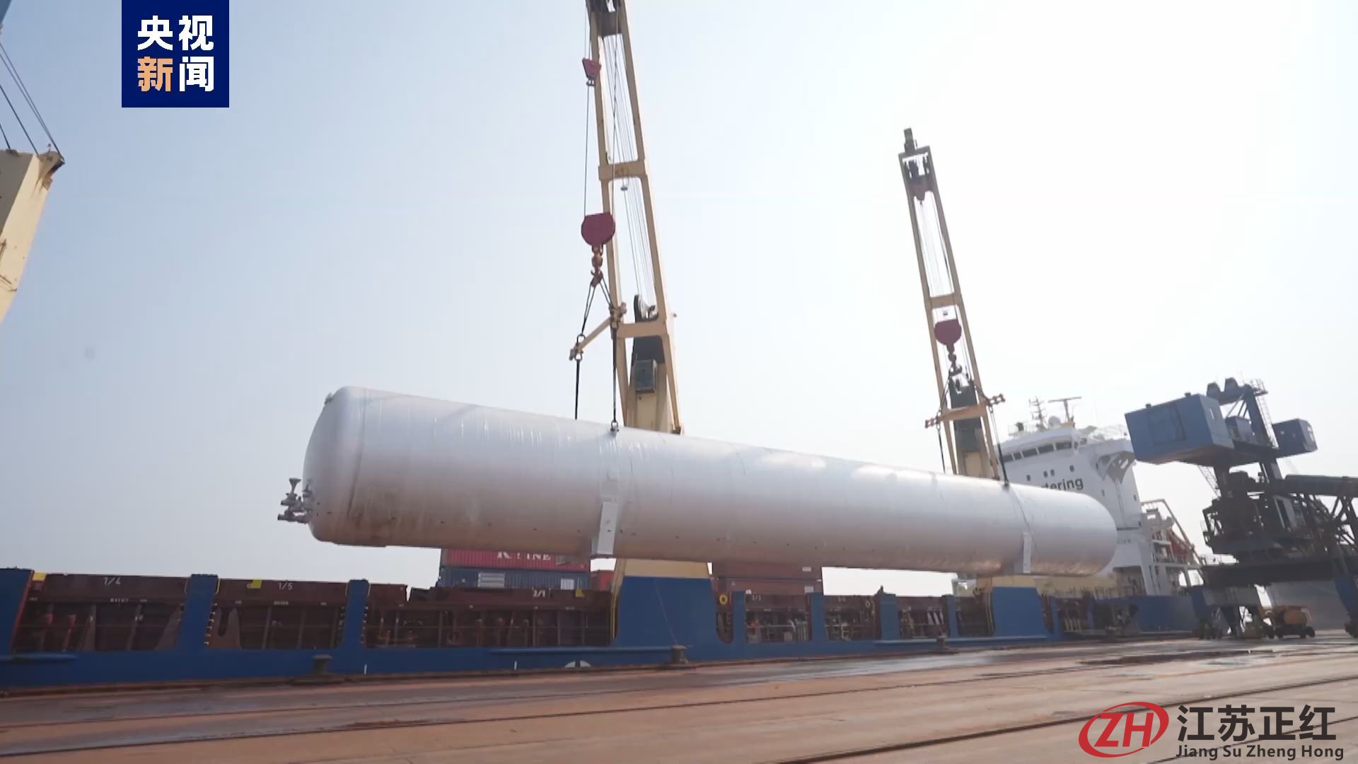 從江蘇海事部門獲悉,6月14日,在江蘇江陰港5號碼頭停靠的安提瓜和巴布達籍船舶甲板上,隨著吊機的精細操作,一個長49.9米、直徑5.8米的白色大儲罐穩穩落下。